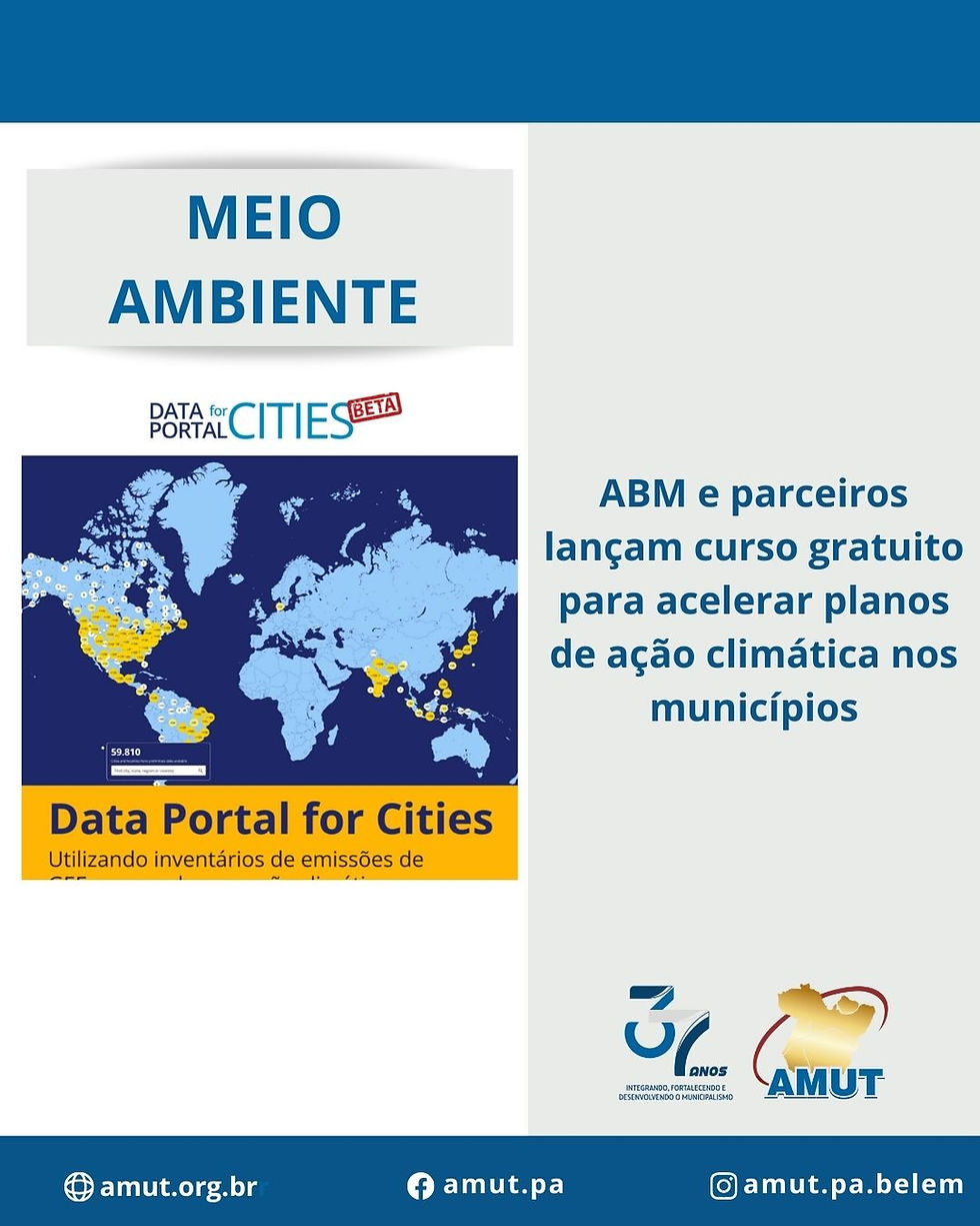 A Associação Brasileira de Municípios (ABM), em parceria com o Pacto Global de Prefeitos pelo Clima e a Energia (GCoM) e a rede C40 Cities, apresenta o curso online Data Portal for Cities: utilizando inventários de emissões de GEE para acelerar a ação climática. A iniciativa visa capacitar tecnicamente as cidades brasileiras para transformarem dados de emissões em estratégias concretas de combate às mudanças climáticas.